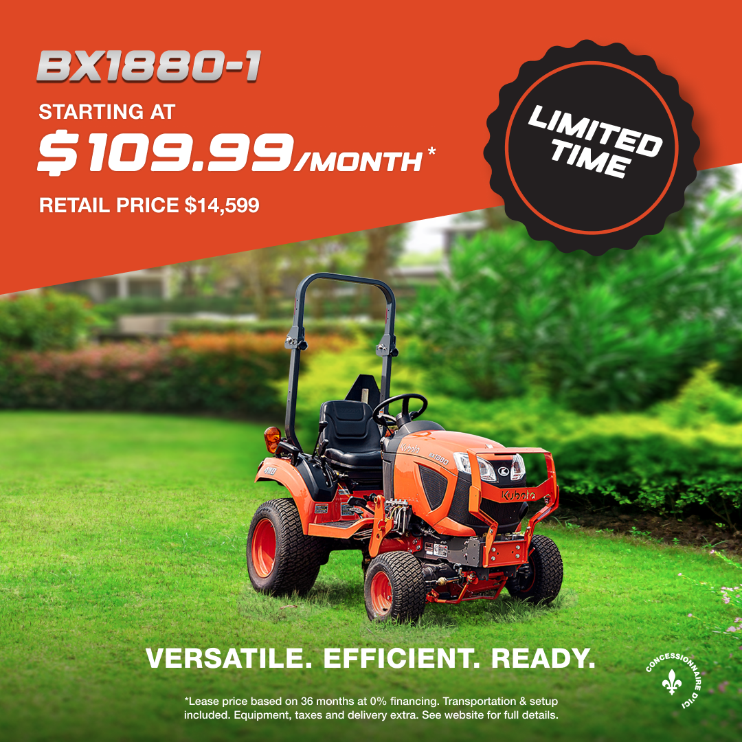 Lease offer available on approved credit. Representative lease example based on a new and previously unregistered BX1880V-1KBT. Lease price is $14,599. 0% lease rate (3.79% effective APR) for 36 months. Monthly lease payment is $109.99 and includes: $470.19 freight; regulatory fees (up to $3.72); lien registration fees (up to $391.00, including lien registering agent fee); and all other applicable fees, levies, and duties (which may vary by region and dealer). Insurance, registration, and applicable sales taxes are extra. $1,559 down payment or equivalent trade-in and $0.00 security deposit due at lease inception. Total lease obligation is $3,959.64. Total of 36 monthly payments required during the lease term. 150 hours total; charge of $25.00/hour for excess hours. Dealer may lease for less. Dealer order or trade may be required (but may not be available in all cases). Offer ends June 30, 2026 and is subject to change or cancellation without notice. See your participating Kubota dealer.